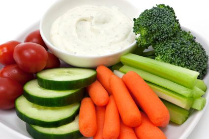 At each meal time, have a piece of fruit or some veggies with a small serving of dairy or peanut butter. Examples include a cup of low-fat milk, non dairy milk, or low-fat yogurt paired with a pear, apple, or a cup of strawberries. Fruit and dairy can also be eaten for snacks and can include string cheese or a glass of skim milk with a handful of raspberries or blueberries.
