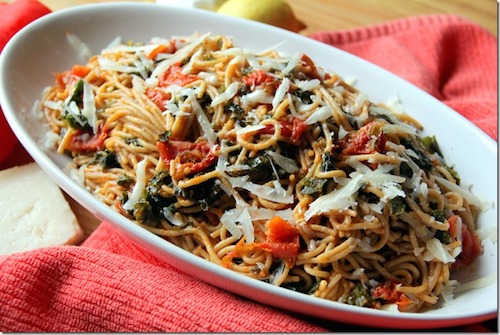 This recipe swaps white flour spaghetti with its fiber-rich whole-wheat counterpart and adorns it with kale, sun-dried tomatoes, and just a touch of cheese. The texture is rich and filling and the appearance is simply a feast for the eyes.