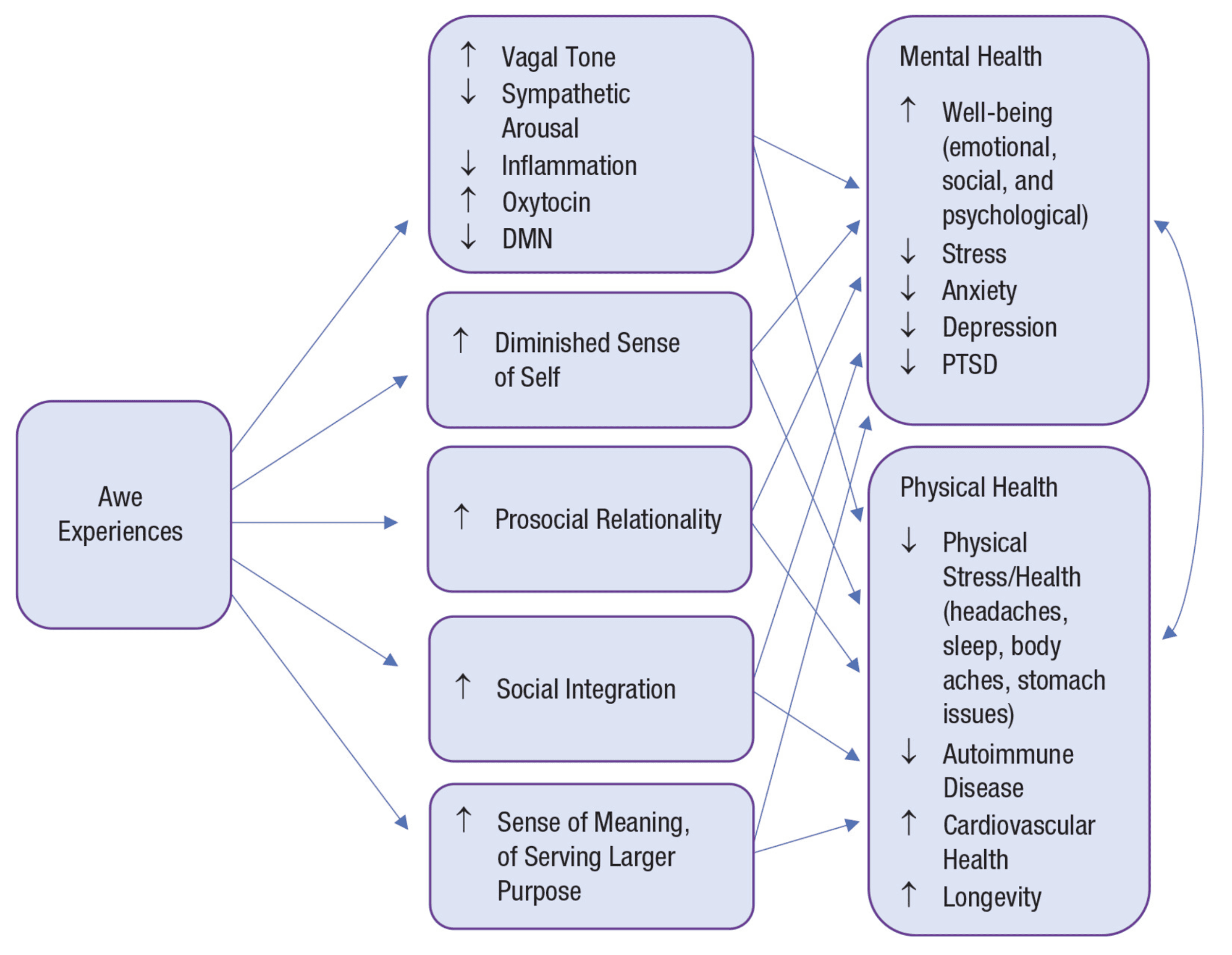 Awe has been shown to quiet the Default Mode Network of the brain—often considered the seat of consciousness—while slowing heart rate, increasing oxytocin and decreasing inflammation. If the DMN is the seat of prospection, then quieting it would reduce the stress of intrusive thoughts and the worries of the day.