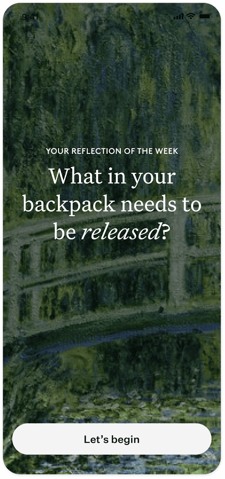 Finally, reflectiveness describes “an intentional, cognitive emotional process for developing, reinforcing, or discarding one’s habits, character, values, or worldview … resulting in an evolution of the self and enhancing meaning and purpose.” By designing a feature meant to encourage moments of pause and reflection, we open the window for something deeper—a eudaimonic experience—to take place. Through thoughtful and accessible text prompts, we aim to deepen the impact of art-viewing—inviting members to turn their gaze inward and reflect on their character, relationships, and daily habits.