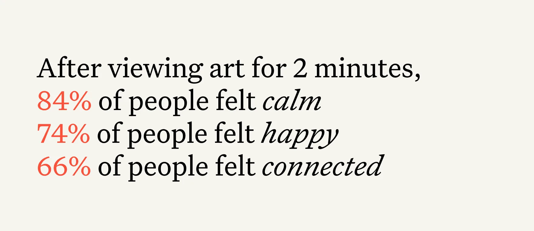 Ultimately, viewing art for two minutes correlated with high positive emotional states across participants – 84% of people felt calm, 74% of people felt happy, and 66% of people felt connected after a short, 2-minute art viewing experience. This finding became the impetus for turning our research into a tool, one that made the therapeutic powers of art accessible to all viewers.