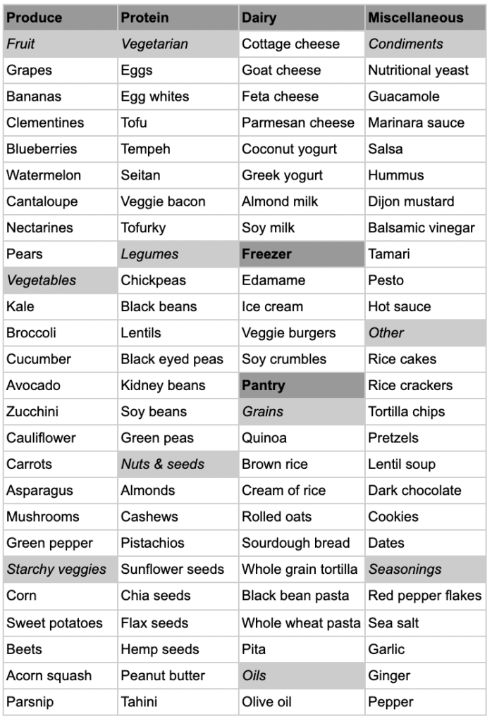 In contrast to the keto grocery list, the vegetarian grocery list includes more fruits, veggies, grains, and plant based protein sources. It is important to note that a grocery list and eating style focused on lots of fresh fruits, vegetables, and grains, takes even more planning! Since these foods ripen and can spoil quickly, make sure you plan out the specific meals you will cook these foods. Below are some of our favorite vegetarian meal prep recipes for the week.