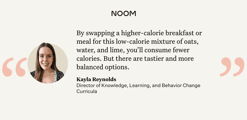 “By swapping a higher-calorie breakfast or meal for this low-calorie mixture of oats, water, and lime, you’ll consume fewer calories,” explains Kayla Reynolds, NASM CPT, the Director of Knowledge, Learning, & Behavior at Noom. “But there are tastier and more balanced options. Try hot oatmeal with berries and low-fat Greek yogurt for added protein and fiber, or opt for a veggie-packed omelet with a sprinkle of cheese for more protein, fiber, vitamins, and minerals.”