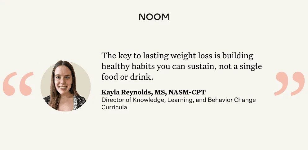 “The key to lasting weight loss is building healthy habits you can sustain, not a single food or drink,” says Kayla Reynolds, MS, NASM-CPT, Director of Knowledge, Learning, & Behavior at Noom.