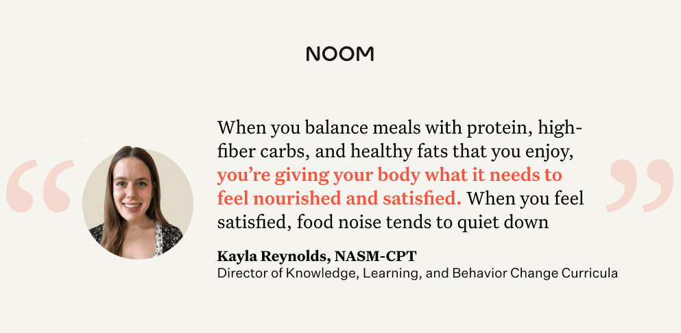 “When you balance meals with protein, high-fiber carbs, and healthy fats that you enjoy, you’re giving your body what it needs to feel nourished and satisfied. When you feel satisfied, food noise tends to quiet down,” says Reynolds.