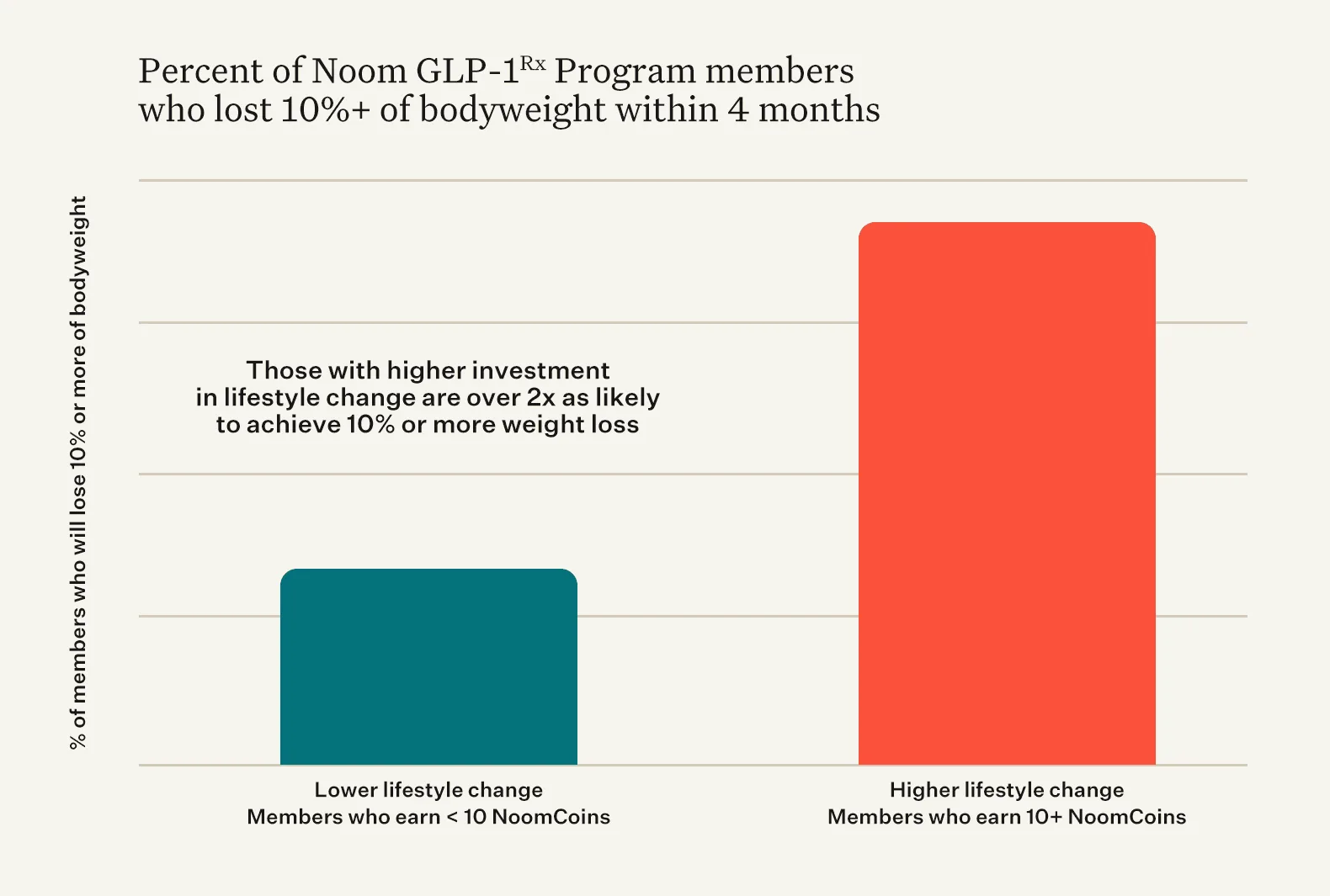 The Noom app experience awards a “NoomCoin” each day that a member completes a set of recommended actions, so we use the number of NoomCoins earned as a measure for a member’s investment in behavior change. Our data shows that Noom GLP-1Rx Program members who use the Noom app regularly (defined as earning 10 or more NoomCoins) have more than double the likelihood of reaching 10% weight loss at 4 months. Powerful habit change combined with personalized pharmacology creates transformational results.