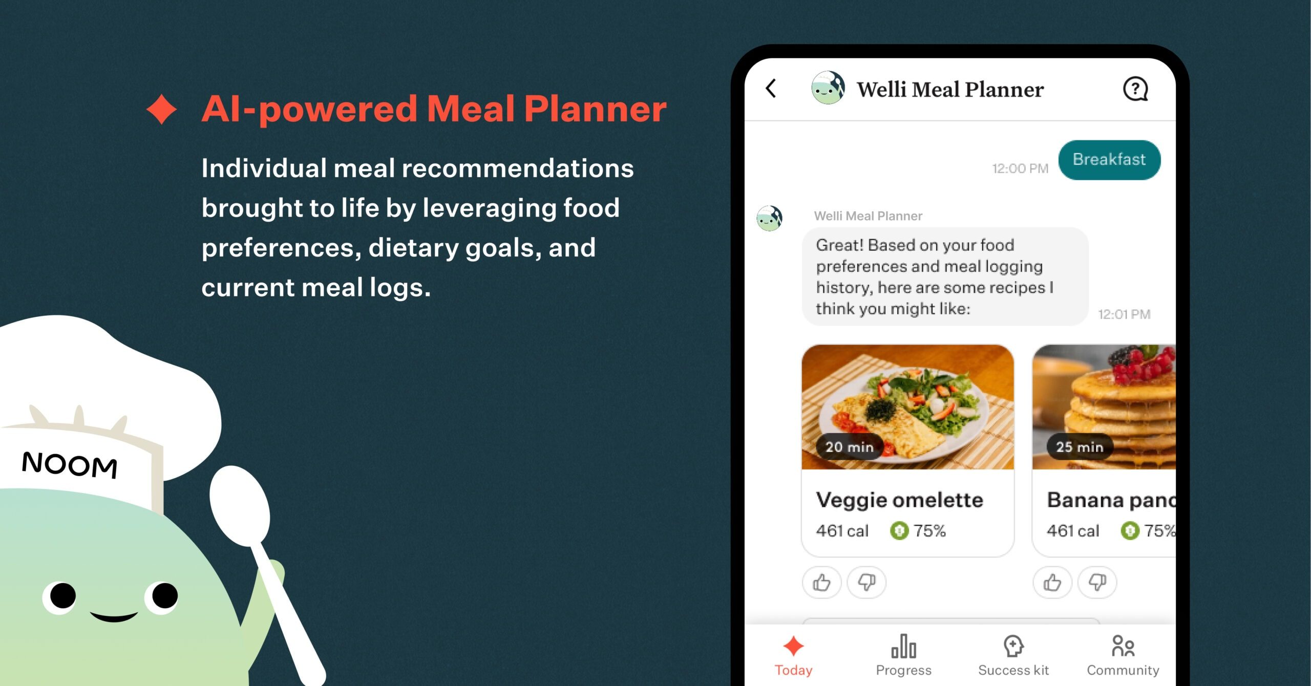 Noom is making meal planning more manageable and personalized with the Welli Meal Planner. This new AI-powered feature brings individual meal recommendations to life by leveraging members’ food preferences, dietary goals, and current meal logs. First-time users take a quick survey to share their dietary restrictions, favorite cuisines, and available cooking time. Welli will present recipe suggestions in an interactive carousel format, complete with the recipe name, calories per serving, and preparation time, making healthy eating simple, customized, and enjoyable.