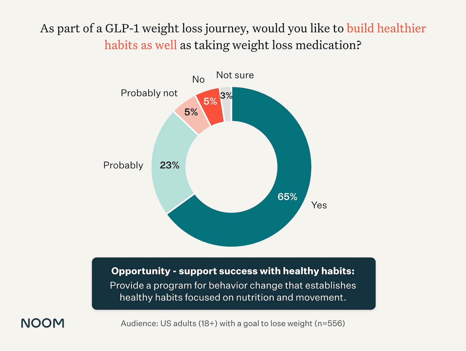 Noom repeatedly found that people interested in starting a medicated weight loss journey expect to engage in multimodal weight loss. Combining medication with a leading behavioral change engine to drive the adoption of healthy habits addresses patient demand. A recent survey of US adults interested in weight loss found that 88% would like to build healthier habits alongside taking the medication.